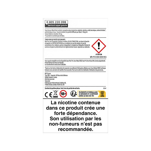 Vuse Saveur Blend Doré : propylène glycol, glycérine végétale, arômes, nicotine, acide benzoïque, acide lactique et eau.