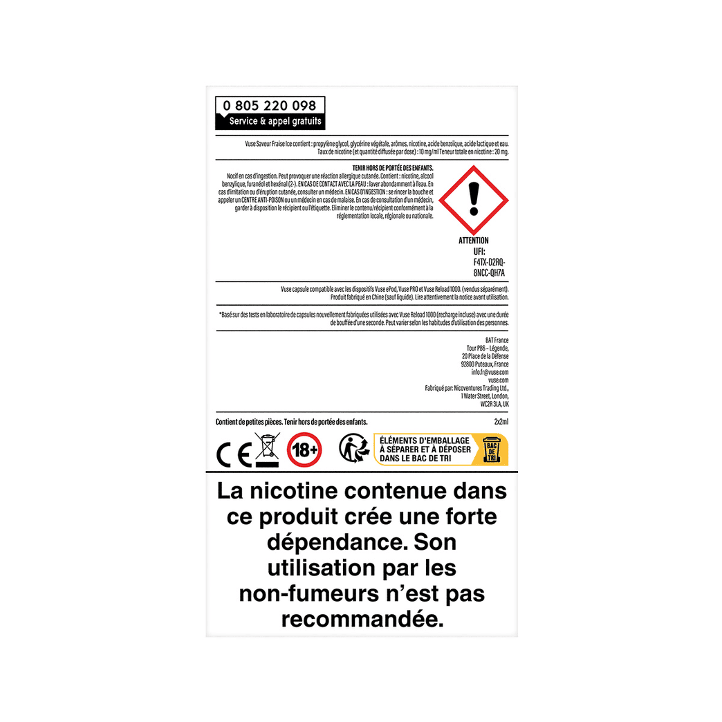 Vuse Saveur Fraise Ice: propylène glycol, glycérine végétale, arômes, nicotine, acide benzoïque, acide lactique et eau.